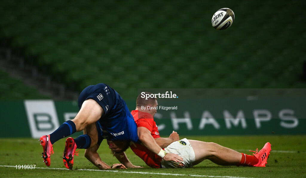 22 August 2020; Jordan Larmour of Leinster in action against Andrew Conway of Munster during the Guinness PRO14 Round 14 match between Leinster and Munster at the Aviva Stadium in Dublin. Photo by David Fitzgerald/Sportsfile