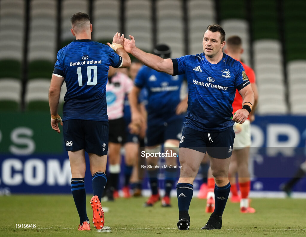 22 August 2020; Cian Healy of Leinster celebrates a Leinster try with team-mate Jonathan Sexton during the Guinness PRO14 Round 14 match between Leinster and Munster at the Aviva Stadium in Dublin. Photo by Stephen McCarthy/Sportsfile
