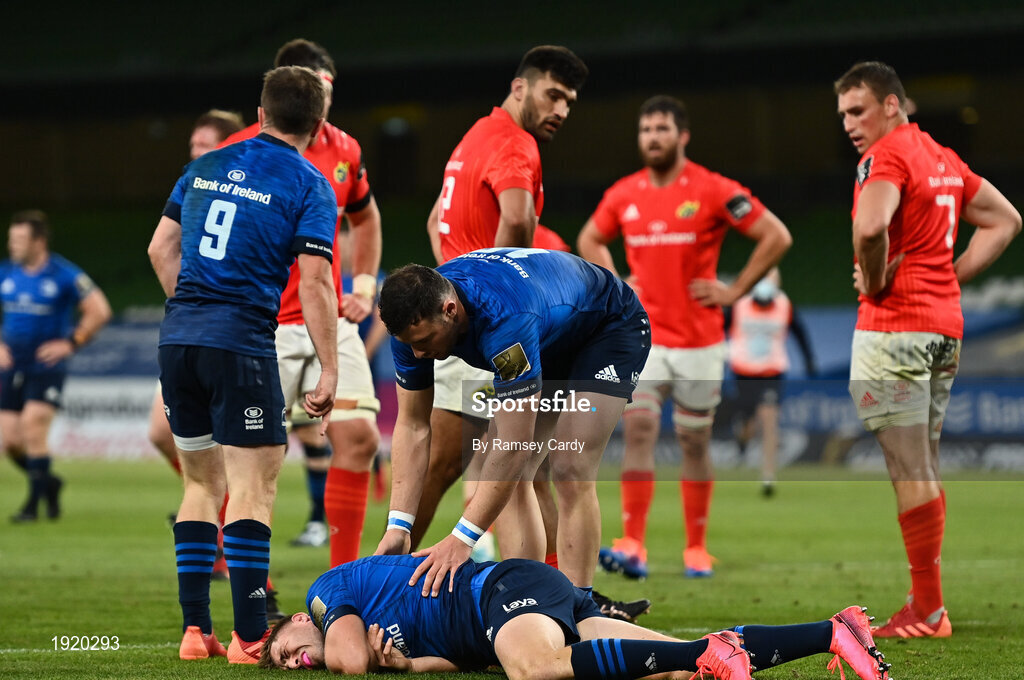22 August 2020; Jordan Larmour of Leinster after picking up an injury during the Guinness PRO14 Round 14 match between Leinster and Munster at the Aviva Stadium in Dublin. Photo by Ramsey Cardy/Sportsfile