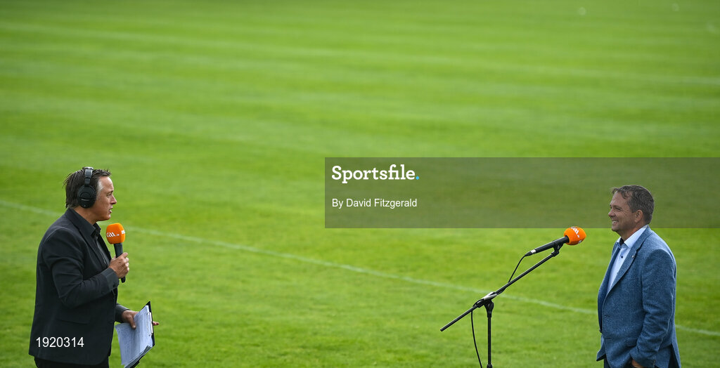 23 August 2020; Wexford senior hurling manager Davy Fitzgerald speaks to TG4 presenter Micheál Ó Domhnaill prior to the Wexford County Senior Hurling Championship Final match between Shelmaliers and Naomh Éanna at Chadwicks Wexford Park in Wexford. Photo by David Fitzgerald/Sportsfile