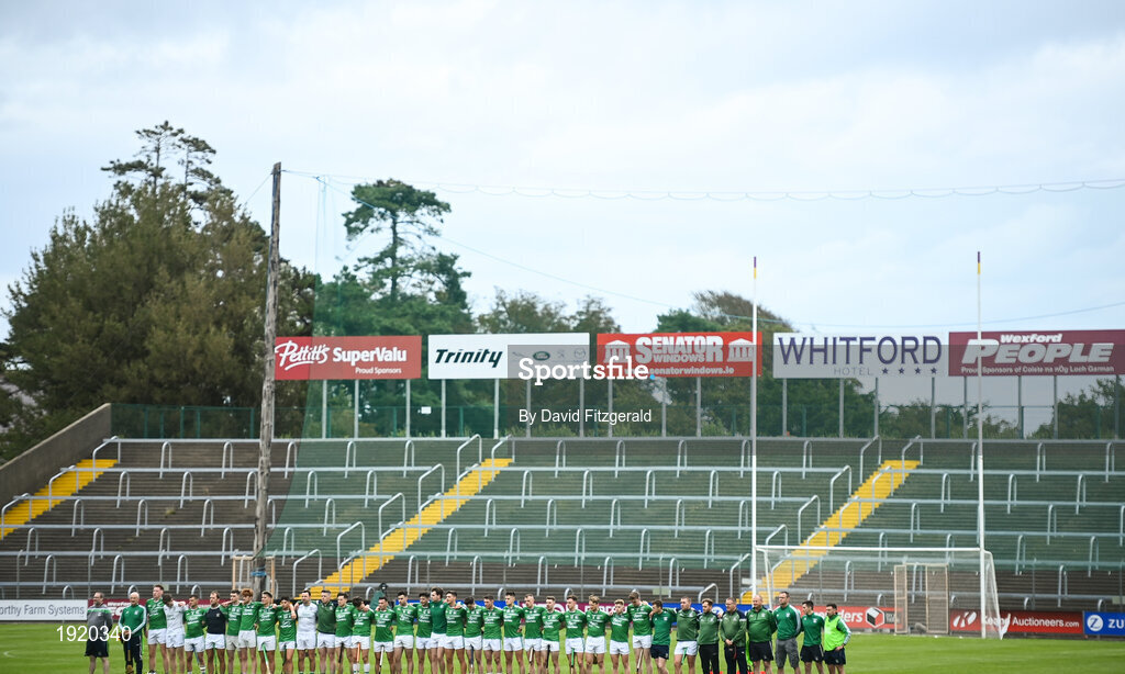 23 August 2020; Naomh Éanna players stand for Amhrán na bhFiann prior to the Wexford County Senior Hurling Championship Final match between Shelmaliers and Naomh Éanna at Chadwicks Wexford Park in Wexford. Photo by David Fitzgerald/Sportsfile