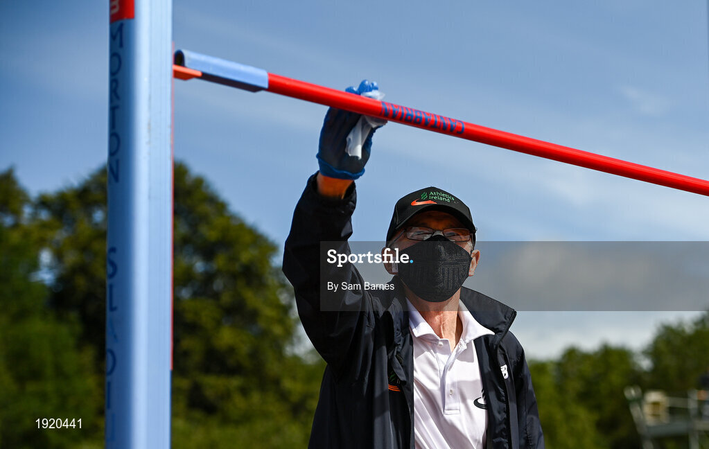23 August 2020; Official Tim Ahern santises the high jump bar during Day Two of the Irish Life Health National Senior and U23 Athletics Championships at Morton Stadium in Santry, Dublin. Photo by Sam Barnes/Sportsfile