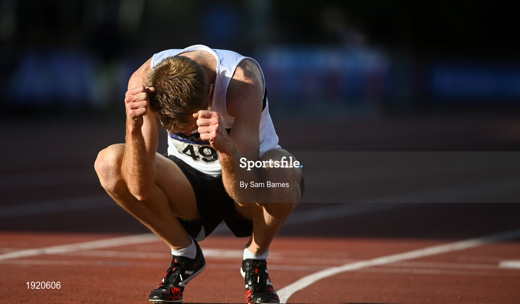 23 August 2020; John Travers of Donore Harriers, Dublin, hits the track in frustration after finishing second in the Men's 5000m during Day Two of the Irish Life Health National Senior and U23 Athletics Championships at Morton Stadium in Santry, Dublin. Photo by Sam Barnes/Sportsfile