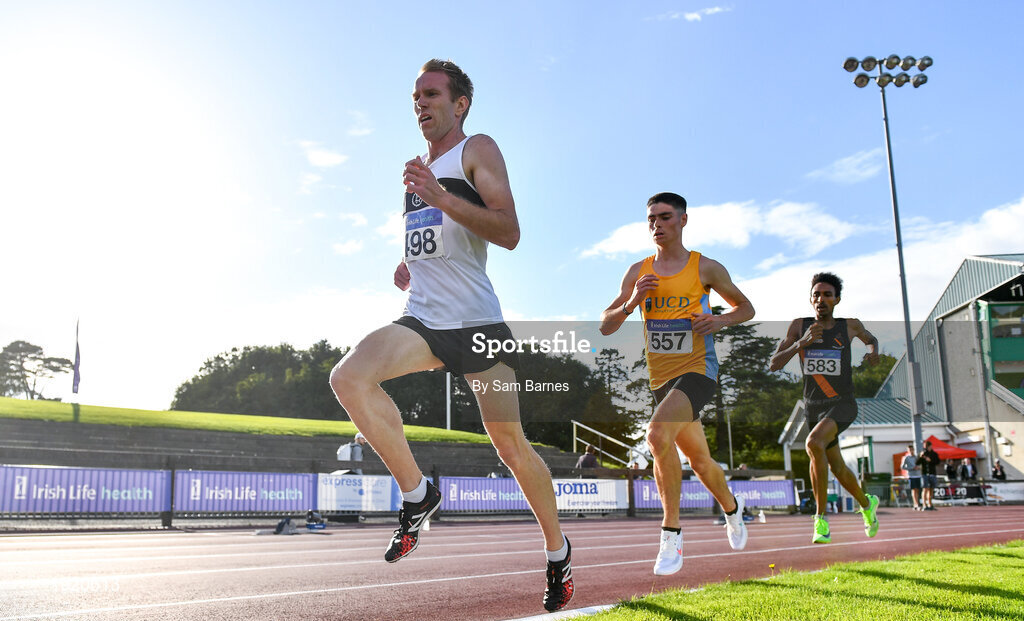 23 August 2020; John Travers of Donore Harriers, Dublin, left, leads from, Darragh McElhinney of U.C.D. AC, Dublin, centre, and Efrem Gidey of Clonliffe Harriers AC, Dublin, whilst competing in the Men's 5000m during Day Two of the Irish Life Health National Senior and U23 Athletics Championships at Morton Stadium in Santry, Dublin. Photo by Sam Barnes/Sportsfile