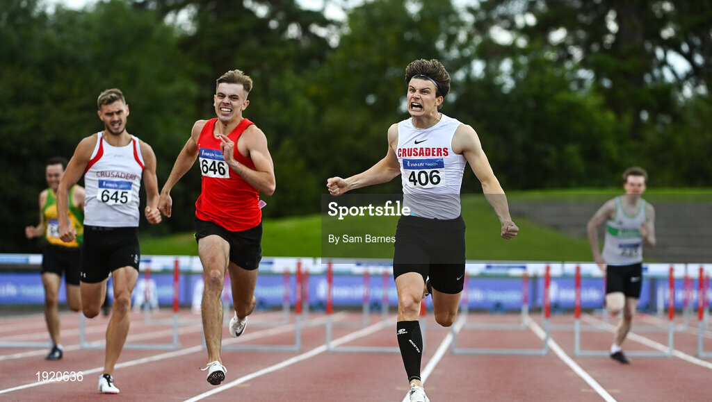 23 August 2020; Matthew Behan of Crusaders AC, Dublin, celebrates on his way to winning the Men's 400m Hurdles during Day Two of the Irish Life Health National Senior and U23 Athletics Championships at Morton Stadium in Santry, Dublin. Photo by Sam Barnes/Sportsfile