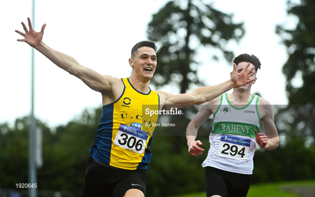 23 August 2020; Stephen Gaffney of UCD AC, Dublin, left, celebrates after winning the Men's 100m, ahead of Mark Smyth of Raheny Shamrock AC, Dublin, during Day Two of the Irish Life Health National Senior and U23 Athletics Championships at Morton Stadium in Santry, Dublin. Photo by Sam Barnes/Sportsfile