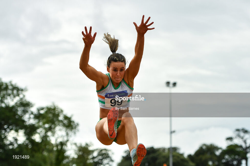 22 August 2020; Saragh Buggy of St. Abbans AC, Laois, competing in the Women's Long Jump during Day One of the Irish Life Health National Senior and U23 Athletics Championships at Morton Stadium in Santry, Dublin. Photo by Sam Barnes/Sportsfile