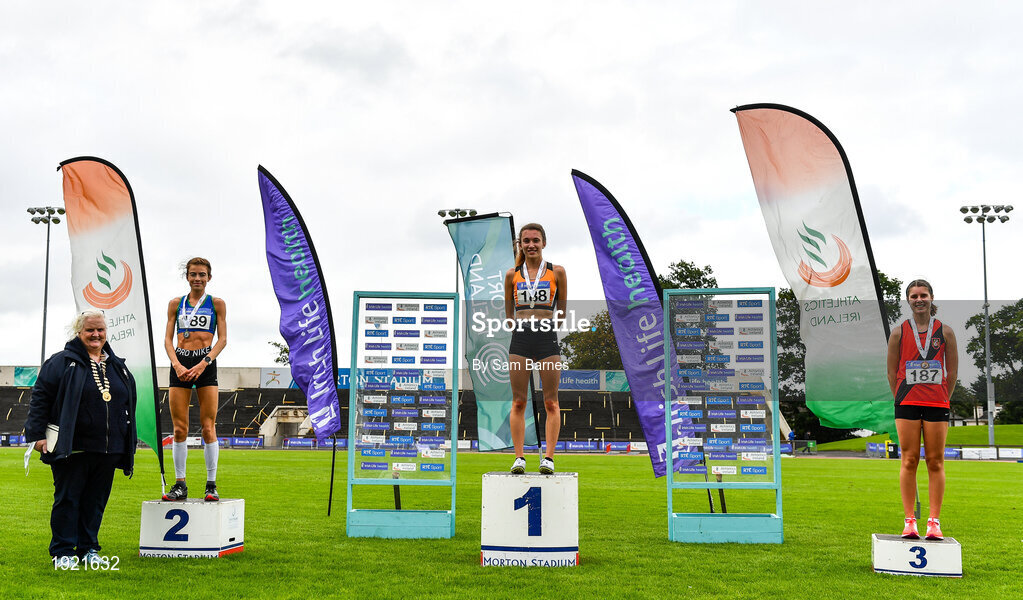 22 August 2020; Athletics Ireland President Georgina Drumm, left, pictured alongside Junior Women 5000m medallists, from left, Celine Gavin of Celtic DCH AC, Dublin, silver, Holly Brennan of Cilles AC, Meath, gold, and Aoife Coffey of Lucan Harriers AC, Dublin, bronze, during Day One of the Irish Life Health National Senior and U23 Athletics Championships at Morton Stadium in Santry, Dublin. Photo by Sam Barnes/Sportsfile