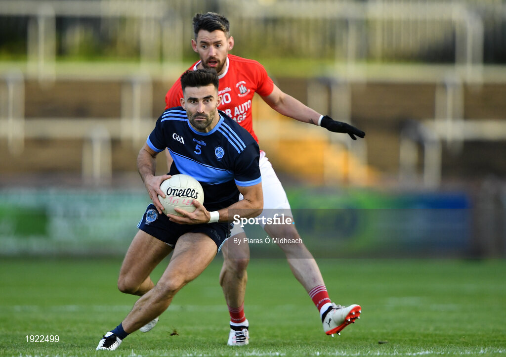 28 August 2020; Tiernan McCann of Killyclogher in action against Mattie Donnelly of Trillick during the Tyrone County Senior Football Championship Quarter-Final match between Trillick St Macartan's and Killyclogher St Mary's at Healy Park in Omagh, Tyrone. Photo by Piaras Ó Mídheach/Sportsfile