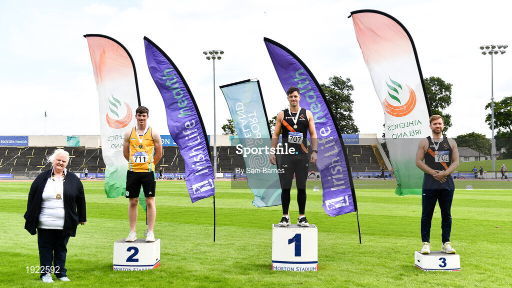 23 August 2020; Athletics Ireland President Georgina Drumm, left, alongside Men's Javelin medallists, from left, Conor Cusack of Lake District Athletics, Mayo, silver, Stephen Rice of Clonliffe Harriers AC, Dubli, gold, and Rory Gunning of Clonliffe Harriers AC, Dublin, bronze, during Day Two of the Irish Life Health National Senior and U23 Athletics Championships at Morton Stadium in Santry, Dublin. Photo by Sam Barnes/Sportsfile