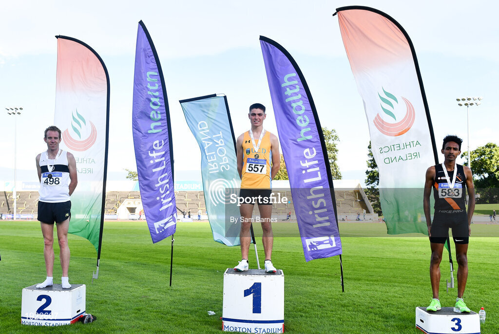 23 August 2020; Men's 5000m medallists, from left, John Travers of Donore Harriers AC, Dublin, silver, Darragh McElhinney of U.C.D. AC, Dublin, gold, and Eferm Gidey of Clonliffe Harriers AC, Dublin, bronze, during Day Two of the Irish Life Health National Senior and U23 Athletics Championships at Morton Stadium in Santry, Dublin. Photo by Sam Barnes/Sportsfile