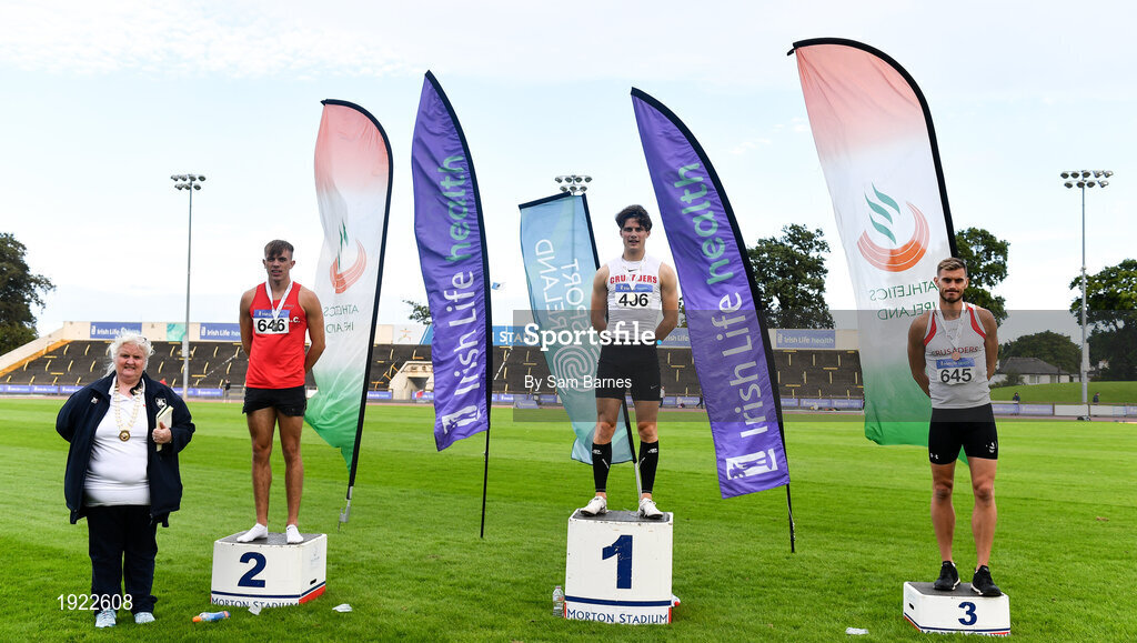 23 August 2020; Athletics Ireland President Georgina Drumm, left, alongside Men's 400m Hurdles medallists, from left, Cathal Locke of Dooneen AC, Limerick, silver, Matthew Behan of Crusaders AC, Dublin, gold, and Jason Harvey of Crusaders AC, Dublin, bronze, during Day Two of the Irish Life Health National Senior and U23 Athletics Championships at Morton Stadium in Santry, Dublin. Photo by Sam Barnes/Sportsfile