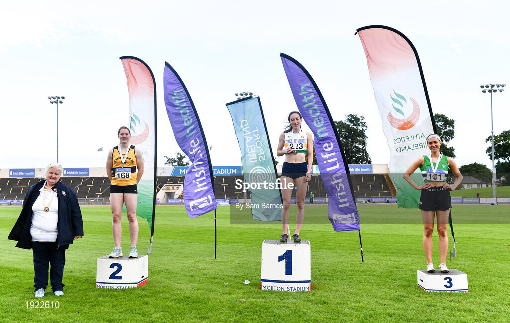 23 August 2020; Athletics Ireland President Georgina Drumm, left, alongside Women's 400m hurdles medallist, from left, Karen Dunne of Bohermeen AC, Meath, silver, Nessa Millet of St. Abbans AC, Laois, gold, and Niamh Malone f Monaghan Phoenix AC, bronze, during Day Two of the Irish Life Health National Senior and U23 Athletics Championships at Morton Stadium in Santry, Dublin. Photo by Sam Barnes/Sportsfile