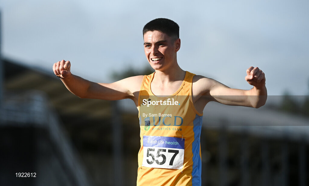 23 August 2020; Darragh McElhinney of U.C.D. AC, Dublin, celebrates after winning the Men's 5000m during Day Two of the Irish Life Health National Senior and U23 Athletics Championships at Morton Stadium in Santry, Dublin. Photo by Sam Barnes/Sportsfile