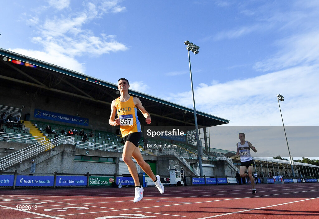 23 August 2020; Darragh McElhinney of U.C.D. AC, Dublin, celebrates as he crosses the line to win the Men's 5000m during Day Two of the Irish Life Health National Senior and U23 Athletics Championships at Morton Stadium in Santry, Dublin. Photo by Sam Barnes/Sportsfile