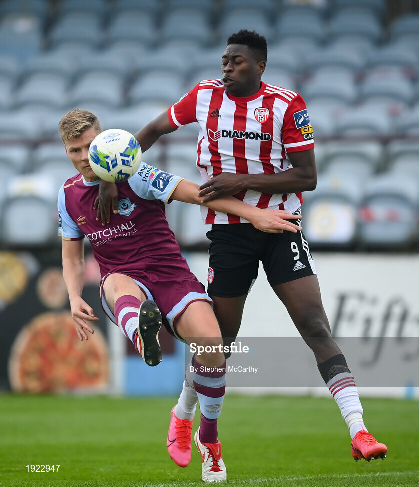 29 August 2020; Derek Prendergast of Drogheda United in action against Ibrahim Meite of Derry City during the Extra.ie FAI Cup Second Round match between Drogheda United and Derry City at United Park in Drogheda, Louth. Photo by Stephen McCarthy/Sportsfile