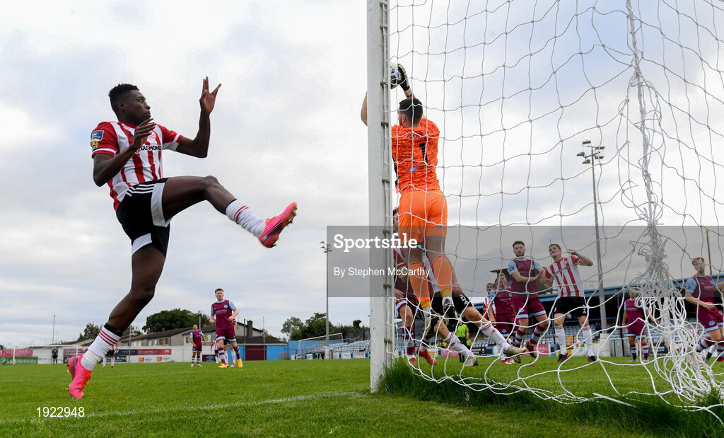 29 August 2020; Ibrahim Meite of Derry City in action against Ross Treacy of Drogheda United during the Extra.ie FAI Cup Second Round match between Drogheda United and Derry City at United Park in Drogheda, Louth. Photo by Stephen McCarthy/Sportsfile
