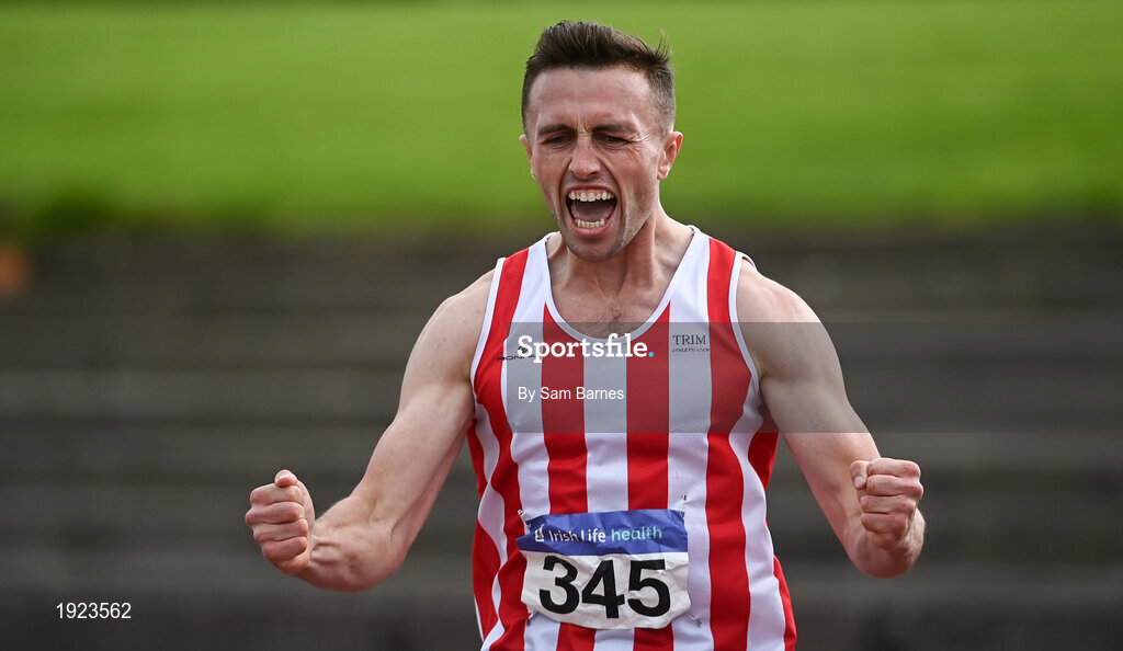 30 August 2020; Harry Purcell of Trim AC, Meath, celebrates after winning the Men's 800m event during day four of the Irish Life Health National Senior and U23 Athletics Championships at Morton Stadium in Santry, Dublin. Photo by Sam Barnes/Sportsfile