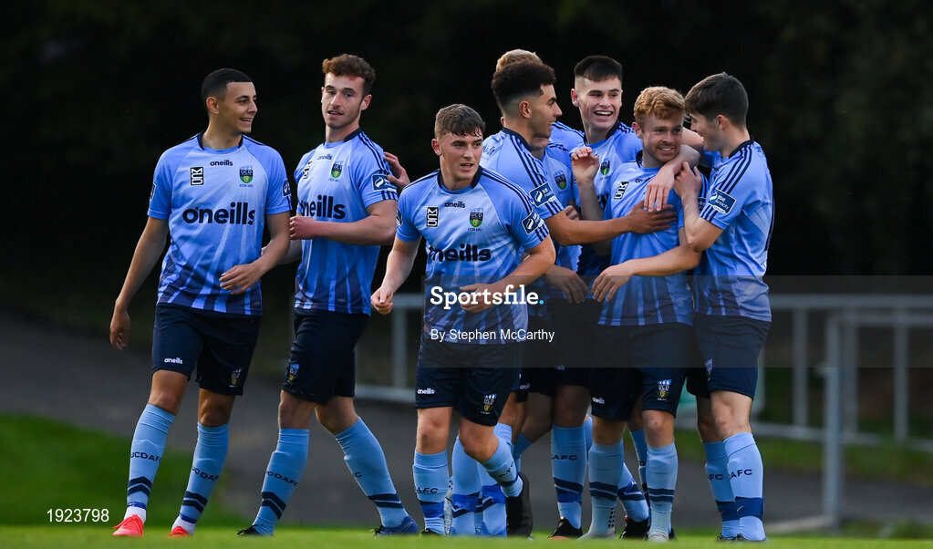 30 August 2020; UCD players celebrate after Paul Doyle, second from left, scored their first goal during the Extra.ie FAI Cup Second Round match between UCD and Sligo Rovers at UCD Bowl in Belfield, Dublin. Photo by Stephen McCarthy/Sportsfile