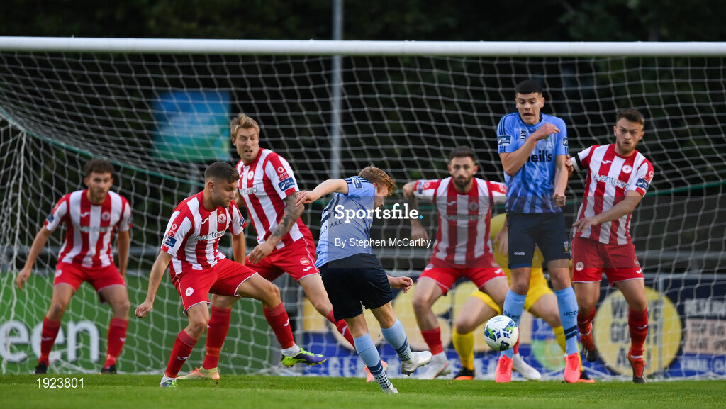 30 August 2020; Paul Doyle of UCD shoots to score his side's first goal during the Extra.ie FAI Cup Second Round match between UCD and Sligo Rovers at UCD Bowl in Belfield, Dublin. Photo by Stephen McCarthy/Sportsfile