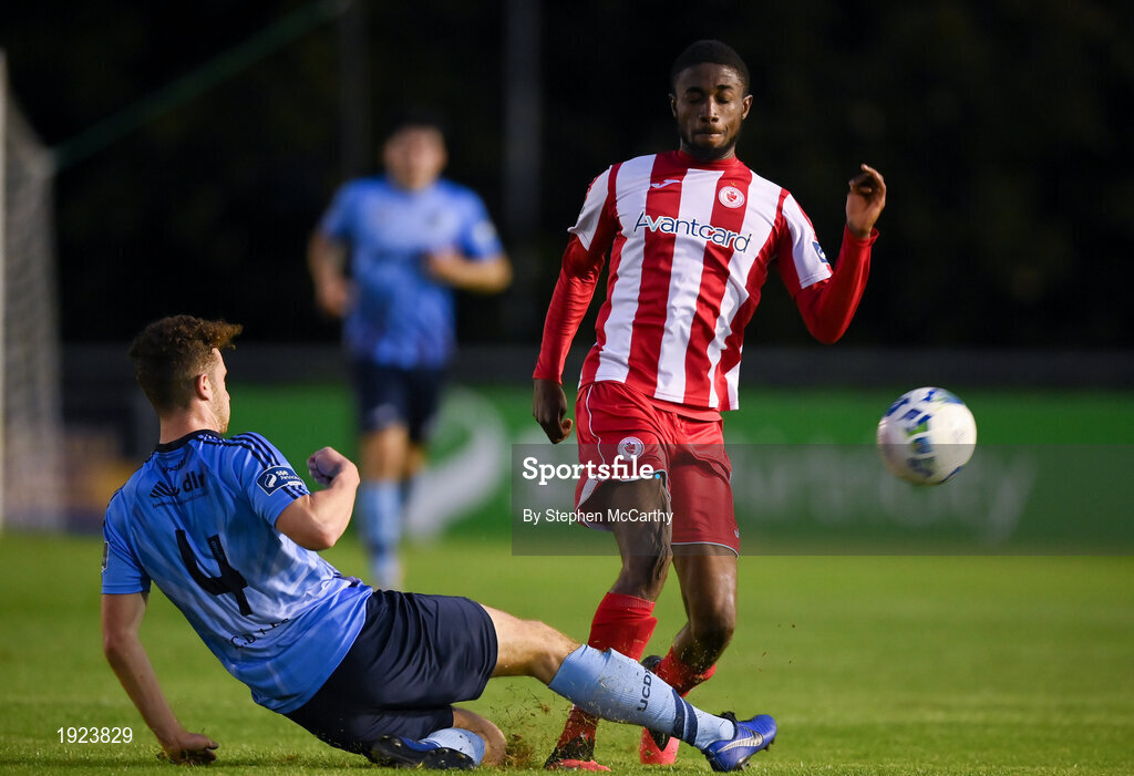30 August 2020; Junior Ogedi-Uzokwe of Sligo Rovers in action against Harry McEvoy of UCD during the Extra.ie FAI Cup Second Round match between UCD and Sligo Rovers at UCD Bowl in Belfield, Dublin. Photo by Stephen McCarthy/Sportsfile