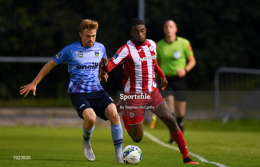 30 August 2020; Junior Ogedi-Uzokwe of Sligo Rovers in action against Paul Doyle of UCD during the Extra.ie FAI Cup Second Round match between UCD and Sligo Rovers at UCD Bowl in Belfield, Dublin. Photo by Stephen McCarthy/Sportsfile