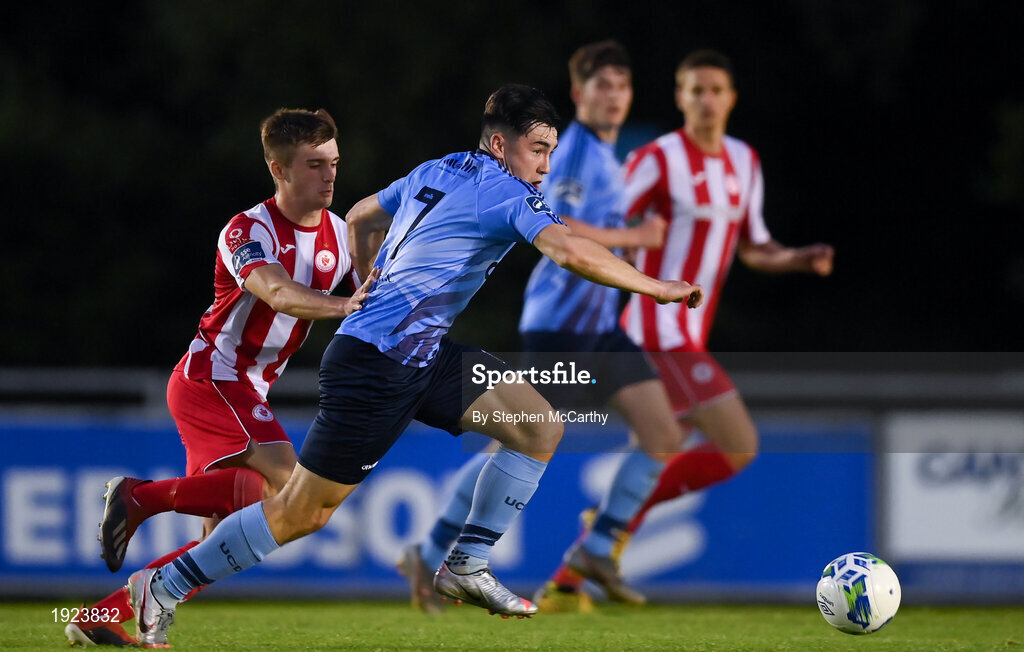 30 August 2020; Liam Kerrigan of UCD in action against Niall Morahan of Sligo Rovers during the Extra.ie FAI Cup Second Round match between UCD and Sligo Rovers at UCD Bowl in Belfield, Dublin. Photo by Stephen McCarthy/Sportsfile