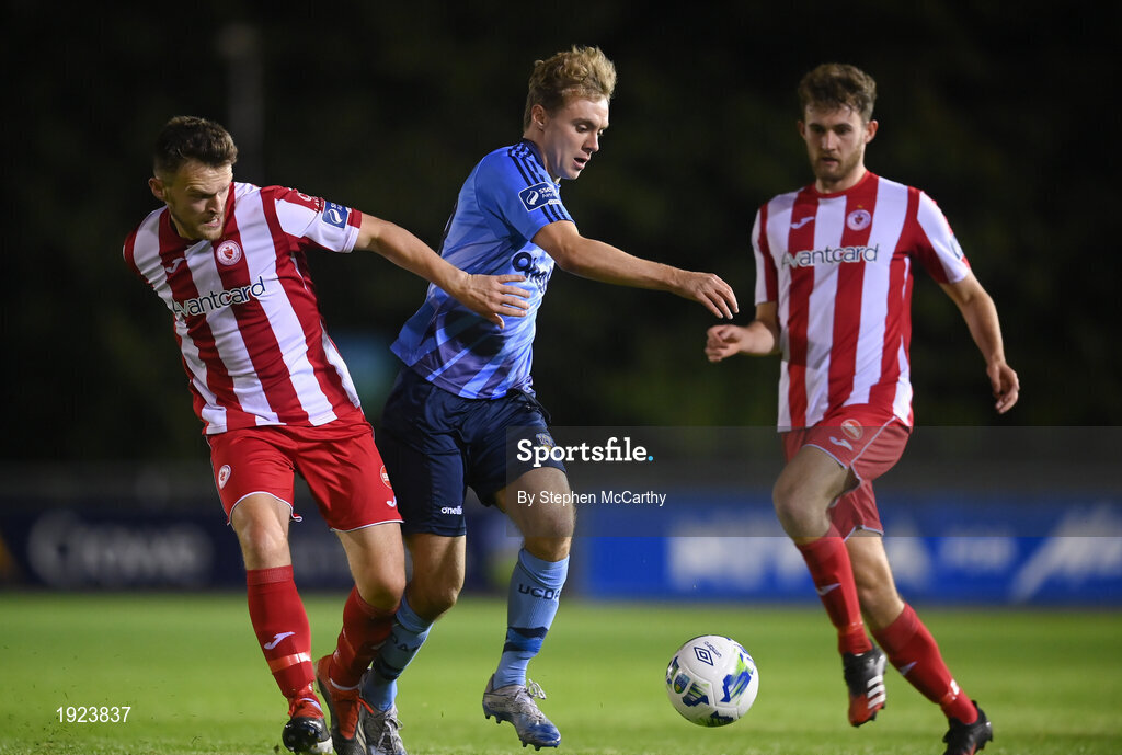 30 August 2020; Mark Dignam of UCD in action against David Cawley of Sligo Rovers during the Extra.ie FAI Cup Second Round match between UCD and Sligo Rovers at UCD Bowl in Belfield, Dublin. Photo by Stephen McCarthy/Sportsfile