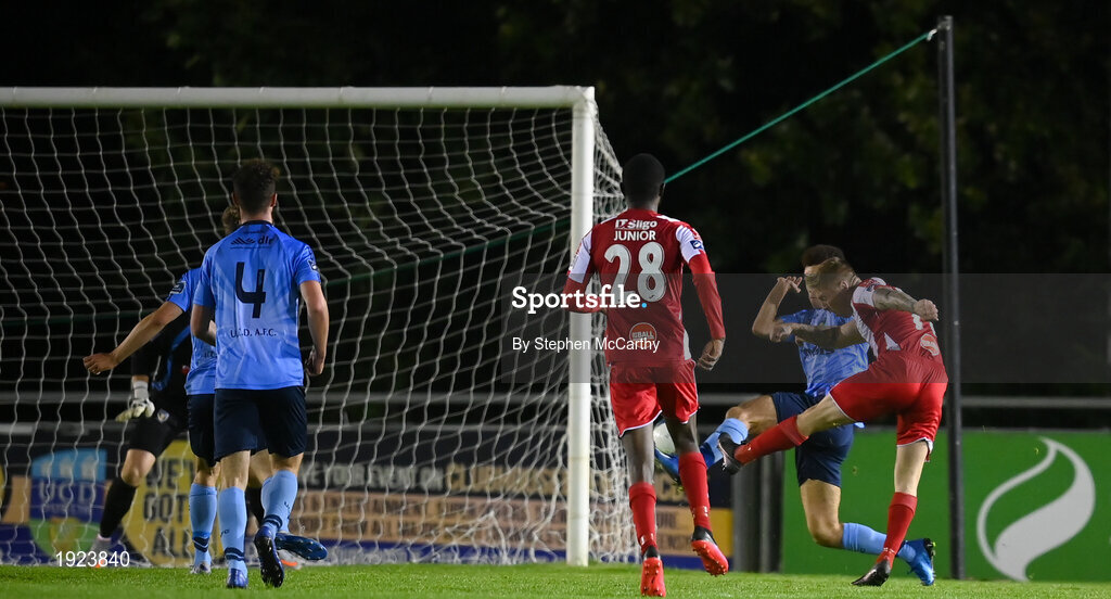 30 August 2020; Jesse Devers of Sligo Rovers shoots to score his side's third goal during the Extra.ie FAI Cup Second Round match between UCD and Sligo Rovers at UCD Bowl in Belfield, Dublin. Photo by Stephen McCarthy/Sportsfile