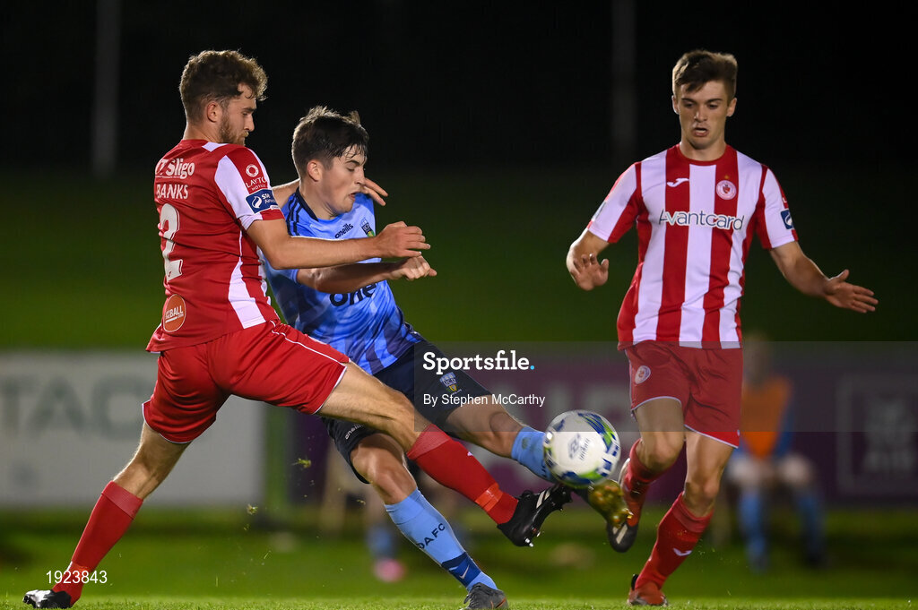 30 August 2020; Colm Whelan of UCD in action against Lewis Banks, left, and Niall Morahan of Sligo Rovers during the Extra.ie FAI Cup Second Round match between UCD and Sligo Rovers at UCD Bowl in Belfield, Dublin. Photo by Stephen McCarthy/Sportsfile