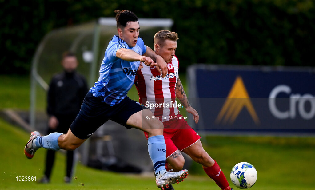 30 August 2020; Liam Kerrigan of UCD in action against Jesse Devers of Sligo Rovers during the Extra.ie FAI Cup Second Round match between UCD and Sligo Rovers at UCD Bowl in Belfield, Dublin. Photo by Stephen McCarthy/Sportsfile
