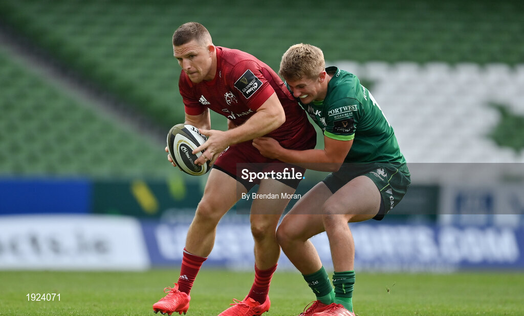 30 August 2020; Andrew Conway of Munster is tackled by Conor Fitzgerald of Connacht during the Guinness PRO14 Round 15 match between Munster and Connacht at the Aviva Stadium in Dublin. Photo by Brendan Moran/Sportsfile
