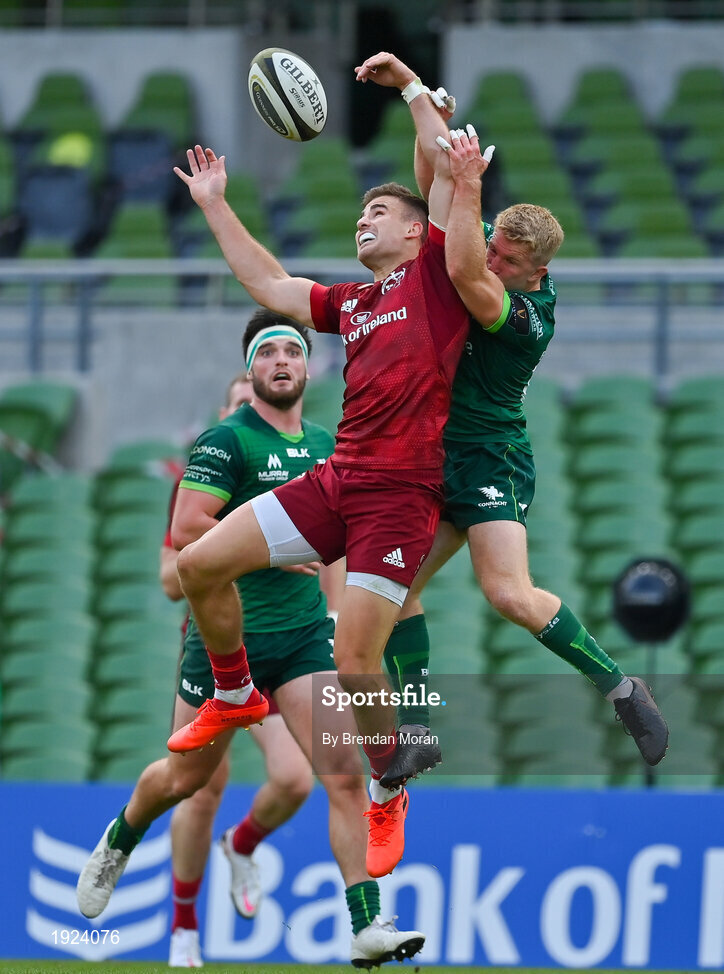 30 August 2020; Shane Daly of Munster in action against Stephen Kerins of Connacht during the Guinness PRO14 Round 15 match between Munster and Connacht at the Aviva Stadium in Dublin. Photo by Brendan Moran/Sportsfile