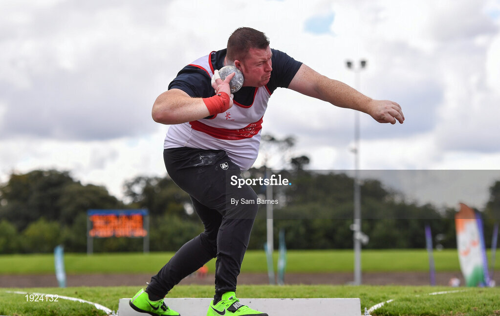 30 August 2020; Sean Breathnach of Galway City Harriers A, competing in the Men's Shot put event during day four of the Irish Life Health National Senior and U23 Athletics Championships at Morton Stadium in Santry, Dublin. Photo by Sam Barnes/Sportsfile
