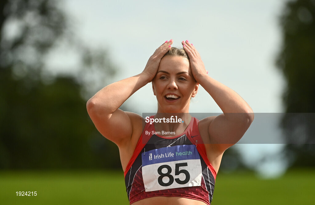 30 August 2020; Lilly-Ann O'Hora of Dooneen AC, Limerick, reacts after finishing second in the Women's 100m Hurdles event during day four of the Irish Life Health National Senior and U23 Athletics Championships at Morton Stadium in Santry, Dublin. Photo by Sam Barnes/Sportsfile