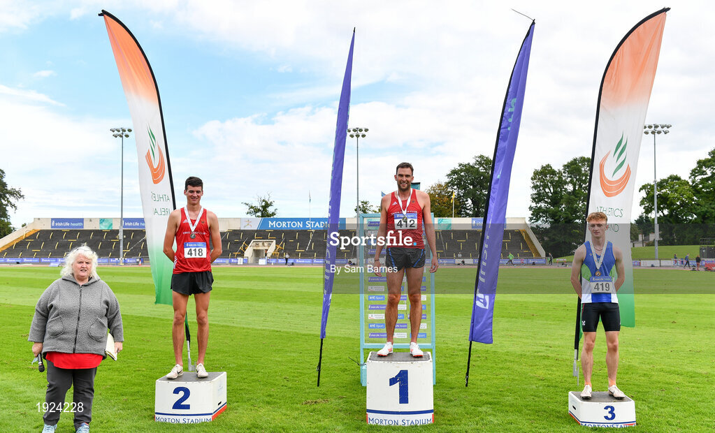 30 August 2020; Athletics Ireland President Georgina Drumm, left, alongside Men's 3000m Steeplechase medallists, from left, Mark Hanrahan of Ennis Track AC, Clare, silver, Rory Chesser of Ennis Track AC, Clare, gold, and Joseph Haynes of Armagh AC, bronze, pretend to acknowledge the crowd during day four of the Irish Life Health National Senior and U23 Athletics Championships at Morton Stadium in Santry, Dublin. Photo by Sam Barnes/Sportsfile