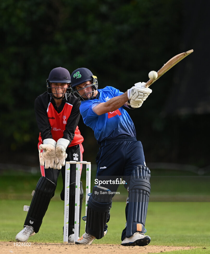 1 September 2020; Curtis Campher of Leinster Lightning his a six watched by Neil Rock of Munster Reds during the 2020 Test Triangle Inter-Provincial Series match between Munster Reds and Leinster Lightning at The Mardyke Cricket Grounds in Cork. Photo by Sam Barnes/Sportsfile