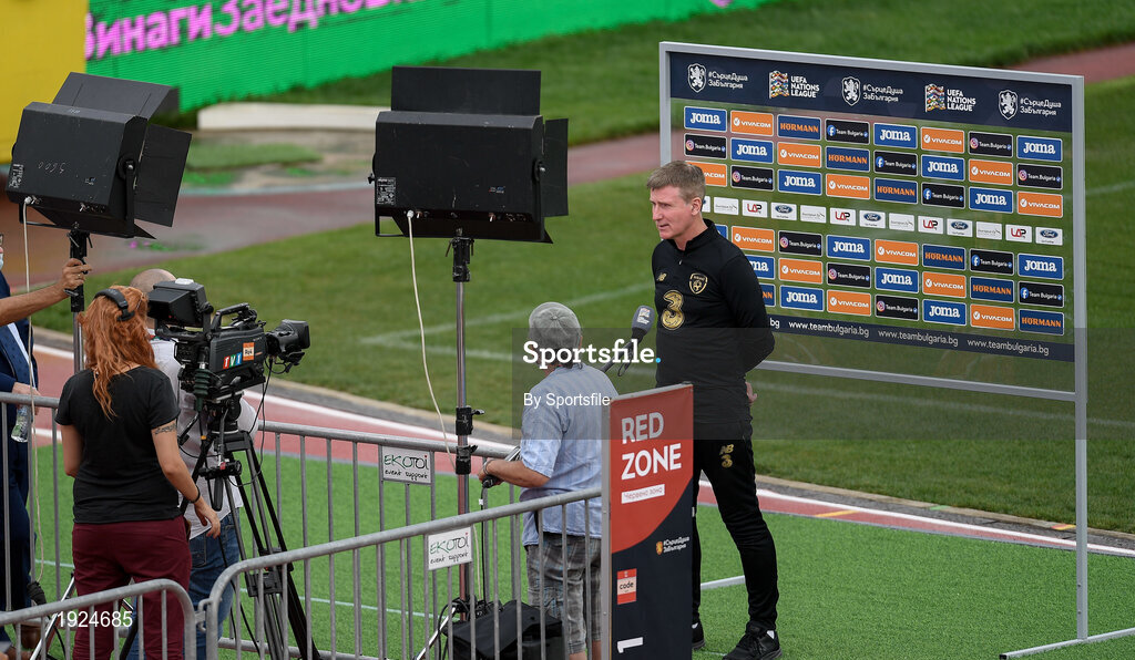 2 September 2020; Republic of Ireland manager Stephen Kenny is interviewed by a television reporter prior to a press conference at Vasil Levski National Stadium in Sofia, Bulgaria. Photo by Alex Nicodim/Sportsfile