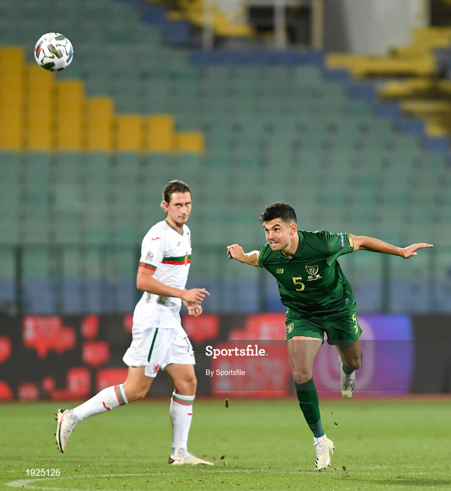 3 September 2020; John Egan of Republic of Ireland in action against Bozhidar Kraev of Bulgaria during the UEFA Nations League B match between Bulgaria and Republic of Ireland at Vasil Levski National Stadium in Sofia, Bulgaria. Photo by Alex Nicodim/Sportsfile