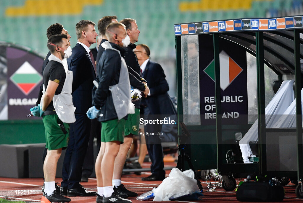 3 September 2020; Republic of Ireland manager Stephen Kenny, second from left, with his backroom staff ahead of the UEFA Nations League B match between Bulgaria and Republic of Ireland at Vasil Levski National Stadium in Sofia, Bulgaria. Photo by Alex Nicodim/Sportsfile