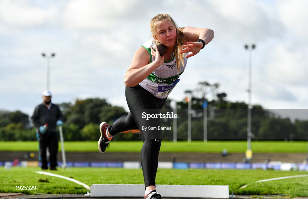 5 September 2020; Ciara Sheehy of Emerald AC, Limerick, on her way to winning the Junior Women's Shot Put event during the Irish Life Health National Junior Track and Field Championships at Morton Stadium in Santry, Dublin. Photo by Sam Barnes/Sportsfile