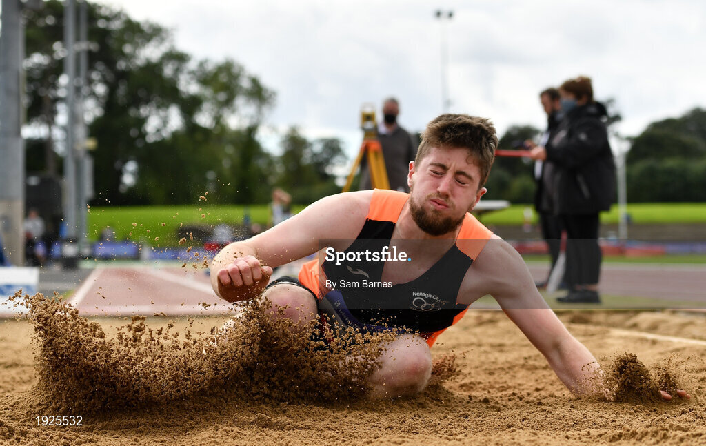 5 September 2020; Darragh Miniter of Nenagh Olympic AC, Tipperary, competing in the Junior Men's Long Jump event during the Irish Life Health National Junior Track and Field Championships at Morton Stadium in Santry, Dublin. Photo by Sam Barnes/Sportsfile