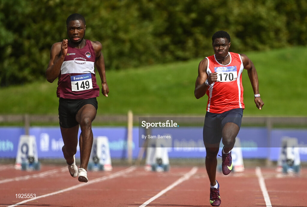 5 September 2020; Charles Okafor of Mullingar Harriers AC, Westmeath, left, on his way to winning the Junior Men's 100m, ahead of Toluwabori Akinola of Fingallians AC, Dublin, during the Irish Life Health National Junior Track and Field Championships at Morton Stadium in Santry, Dublin. Photo by Sam Barnes/Sportsfile