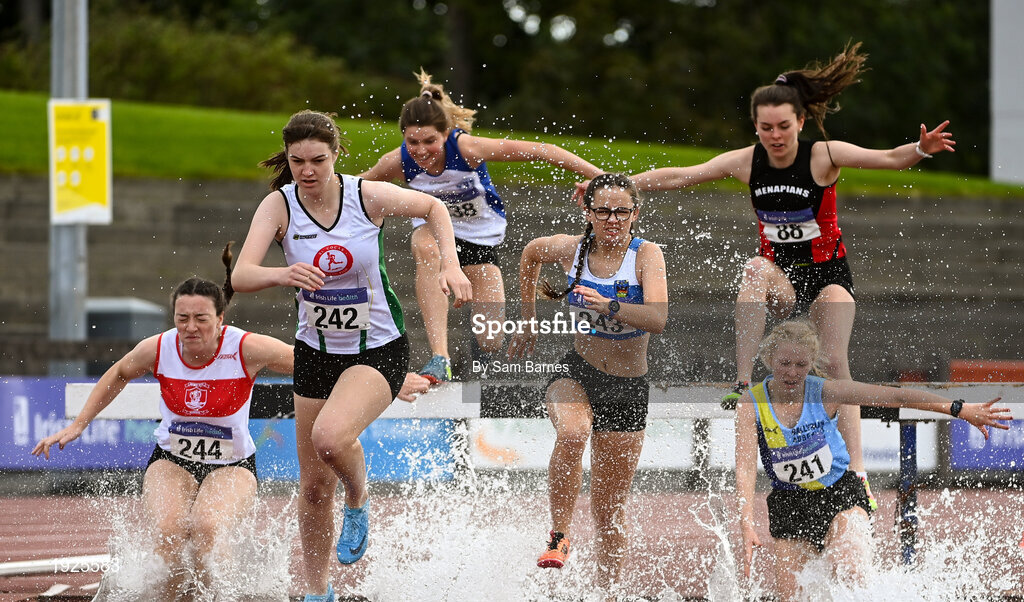 5 September 2020; Kirsten Monaghan of St Coca's AC, Kildare, second from left, leads the field whilst competing in the Junior Women's 3000m Steeplechase event during the Irish Life Health National Junior Track and Field Championships at Morton Stadium in Santry, Dublin. Photo by Sam Barnes/Sportsfile