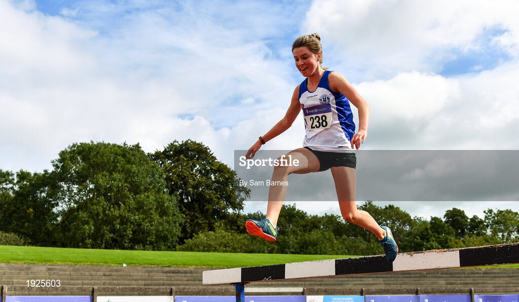 5 September 2020; Cara McNally of Lusk AC, Dublin, on her way to winning the Junior Women's 3000m Steeplechase event during the Irish Life Health National Junior Track and Field Championships at Morton Stadium in Santry, Dublin. Photo by Sam Barnes/Sportsfile