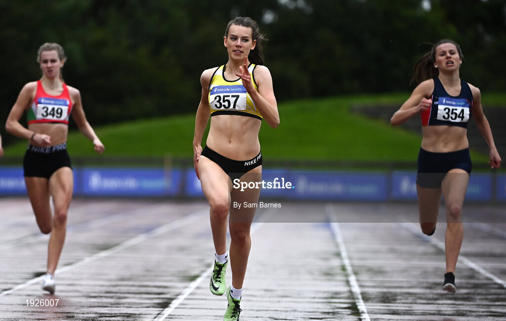 5 September 2020; Lauren McCourt of Bandon AC, Cork, centre, on her way to winning the Junior Women's 400m event during the Irish Life Health National Junior Track and Field Championships at Morton Stadium in Santry, Dublin. Photo by Sam Barnes/Sportsfile