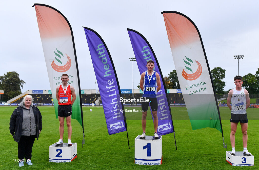 5 September 2020; Athletics Ireland President Georgina Drumm, left, with Junior Men's 1500m medallists, from left, Tadgh Donnelly of Drogheda and District AC, Louth, silver, Sean Donoghue of Celtic DCH AC, Dublin, gold, and Michael Morgan of Sligo AC, bronze, during the Irish Life Health National Junior Track and Field Championships at Morton Stadium in Santry, Dublin. Photo by Sam Barnes/Sportsfile