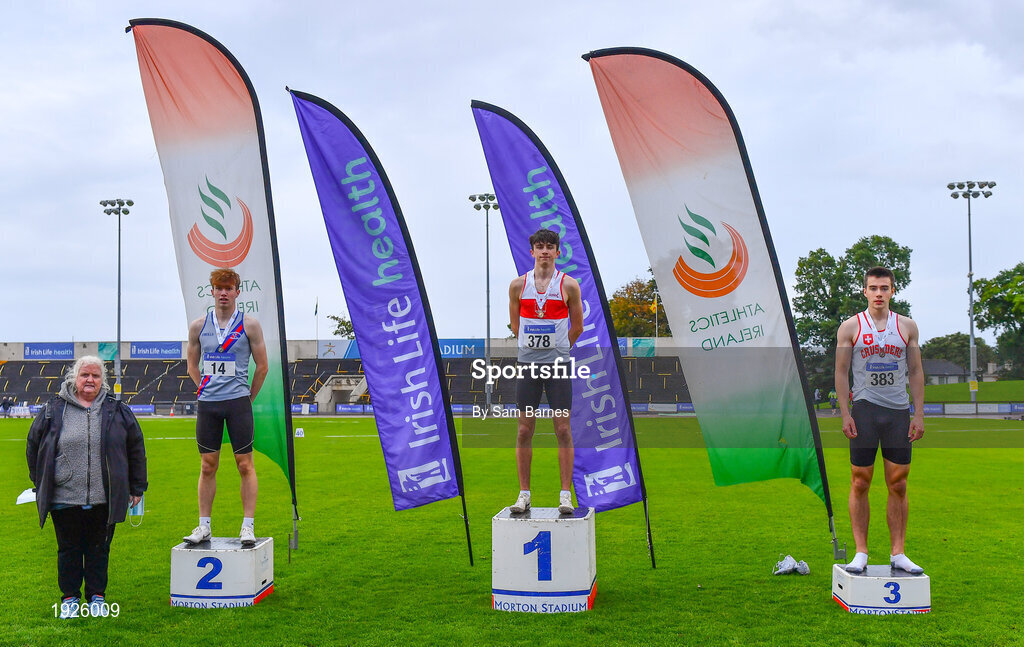 5 September 2020; Athletics Ireland President Georgina Drumm, left, alongside Junior Men's 400m medallists, from left, Cian Dunne of Dundrum South Dublin AC, silver, Robert McDonnell of Galway City Harriers AC, gold, and Hugo Magee of Crusaders AC, Dublin, bronze, during the Irish Life Health National Junior Track and Field Championships at Morton Stadium in Santry, Dublin. Photo by Sam Barnes/Sportsfile