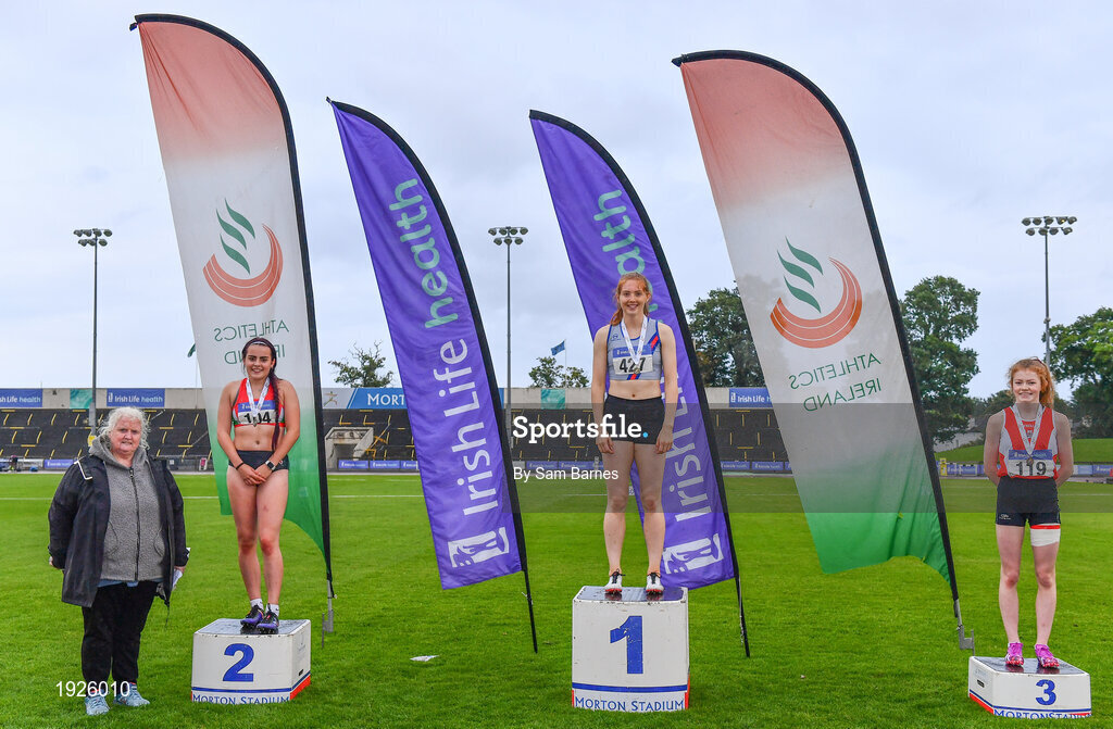 5 September 2020; Athletics Ireland President Georgina Drumm, left, alongside Junior Women's 200m medallists, from left, Jenna Breen of City of Lisburn AC, Down, silver, Molly Hourihan of Dundrum South Dublin AC, gold, and Elizabeth Gahan of Enniscorthy AC, Wexford, bronze, during the Irish Life Health National Junior Track and Field Championships at Morton Stadium in Santry, Dublin. Photo by Sam Barnes/Sportsfile