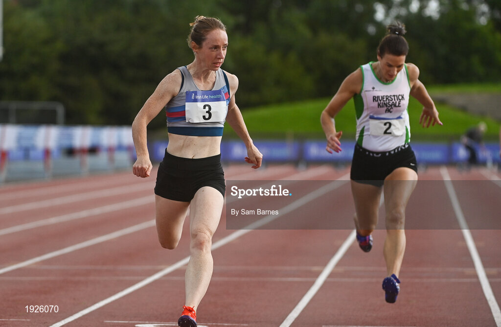 6 September 2020; Avril Dillon of Dundrum South Dublin AC, crosses the line to win the W40 Women's 100m event during the Irish Life Health National Masters Track and Field Championships at Morton Stadium in Santry, Dublin. Photo by Sam Barnes/Sportsfile